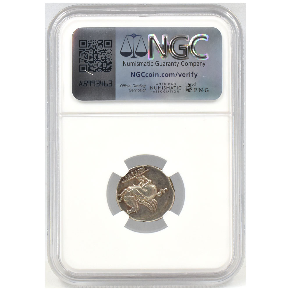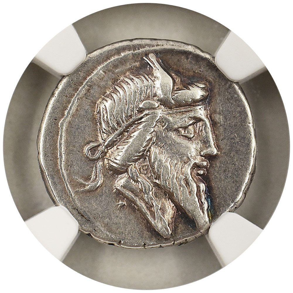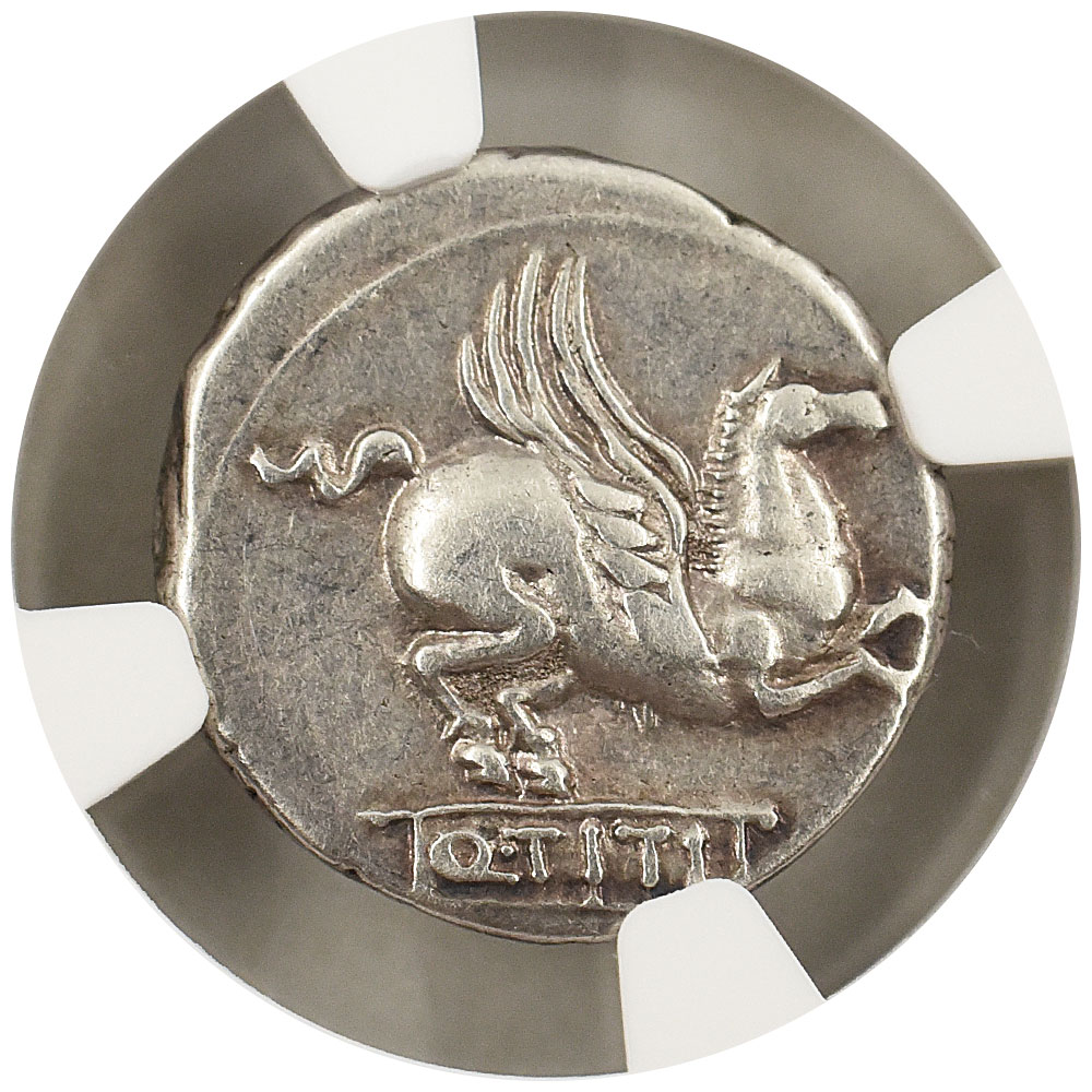 グレード Ch VF Strike:5/5 Surface:3/5 発行年 c.90BC 国名 ローマ共和国 通貨 デナリウス 鑑定会社表示名 ムティヌス・ティティヌス 台上のペガサス 素材 銀貨