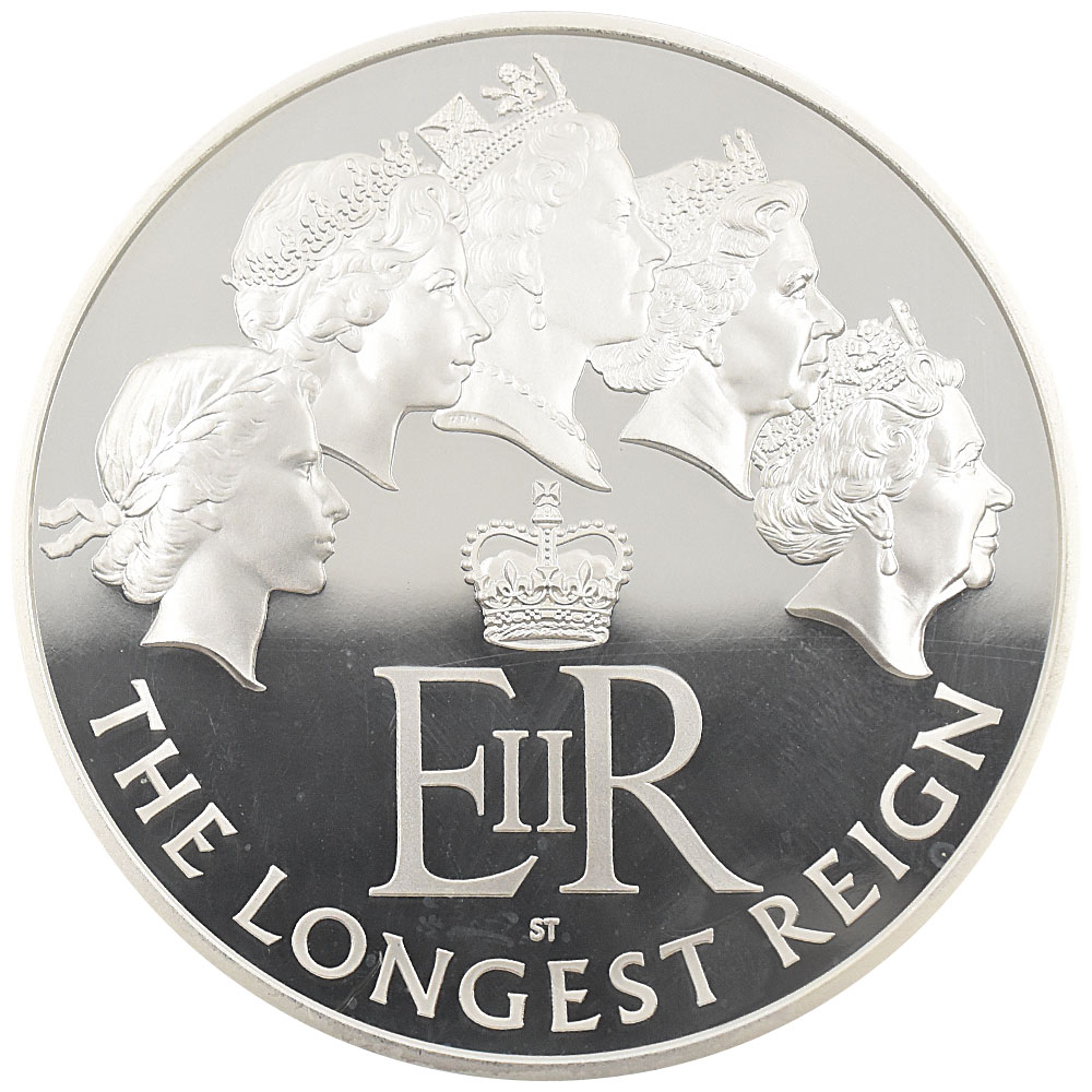 2015年、エリザベス2世女王の最長在位記録を記念して発行された大型銀貨です。