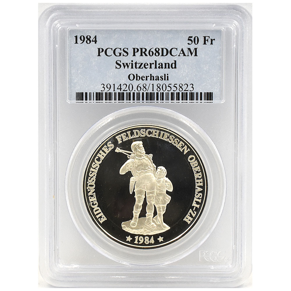 スイス 1984 50フラン 銀貨 PCGS PR68DCAM オーバーハスリ射撃祭 18055823