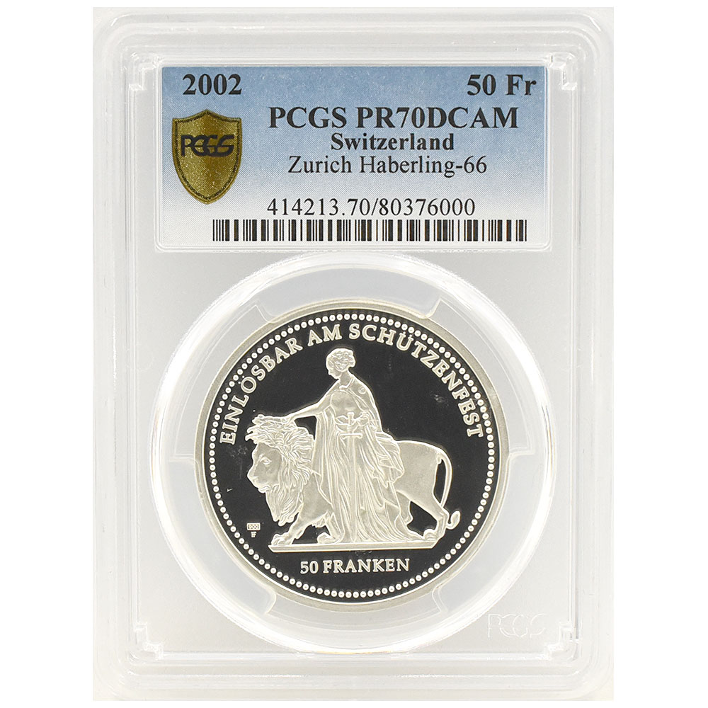 スイス 2002 50フラン 銀貨 PCGS PR70DCAM ウナ&ライオン チューリッヒ射撃祭 80376000