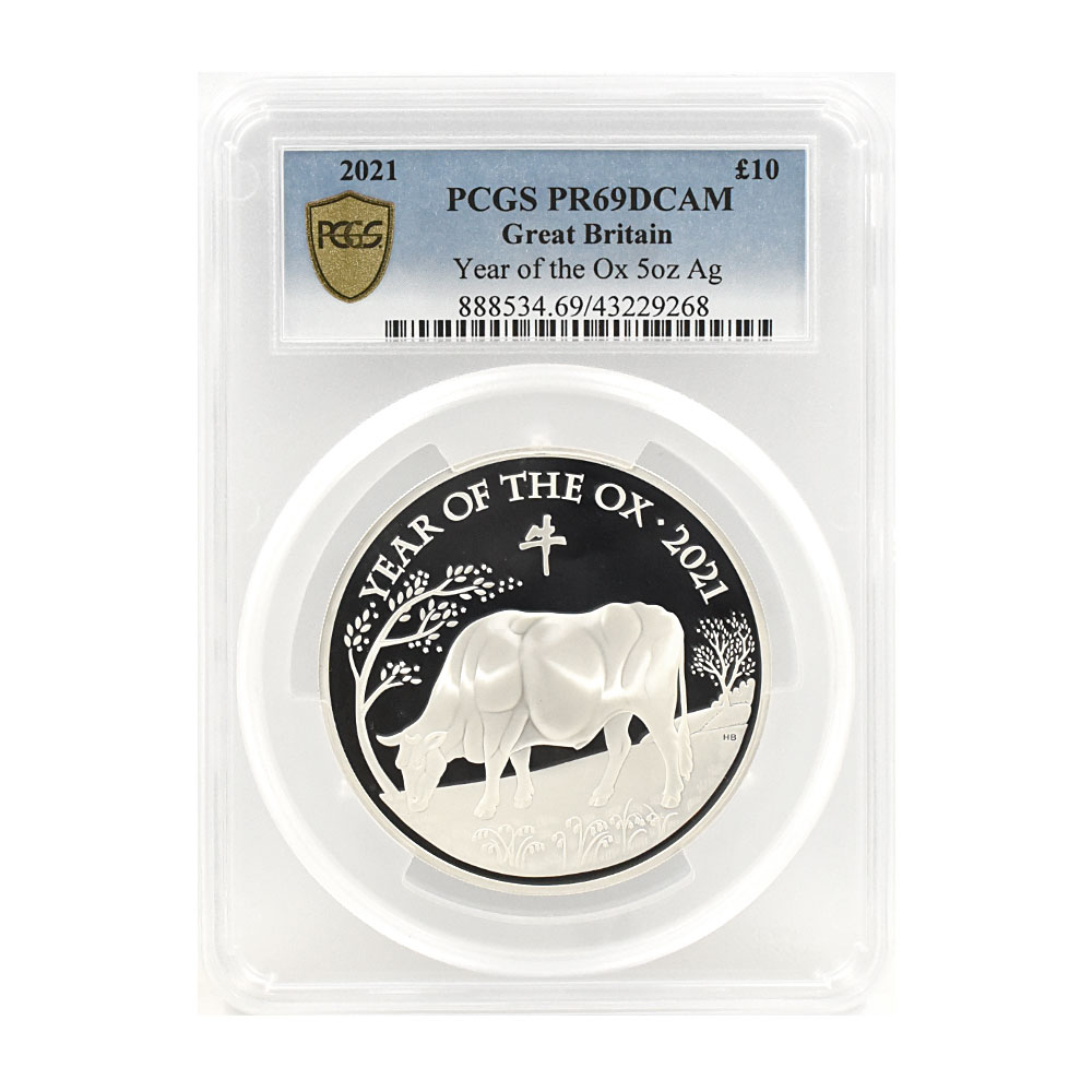 グレード PR69DCAM 発行年 2021 国名 イギリス 通貨 10ポンド 5オンス 鑑定会社表示名 干支丑年 素材 銀貨