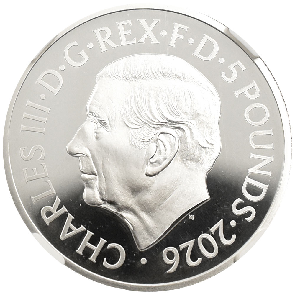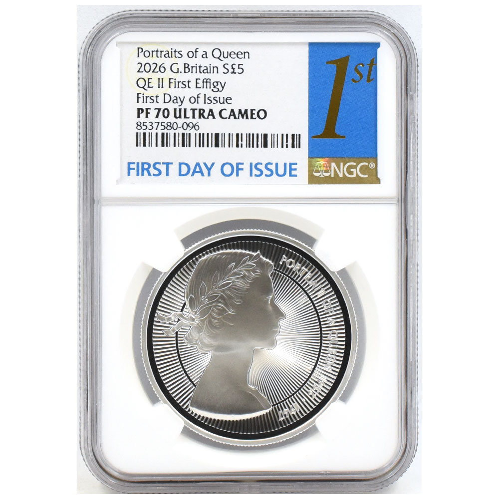 グレード PF70UC 発行年 2026 国名 イギリス 通貨 5ポンド 鑑定会社表示名 エリザベス2世のコイン肖像シリーズ 第一弾 ヤングヤングエリザベス タイプ 発行即日鑑定品 素材 銀貨